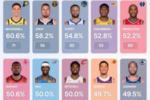 1、麦康纳 60.6%(出手71次)