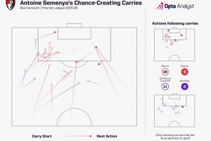 据Opta统计,塞梅尼奥本赛季英超带球射门16次、创造11次机会,带球后打进3球、助攻2次,展现了不俗的突击能力。