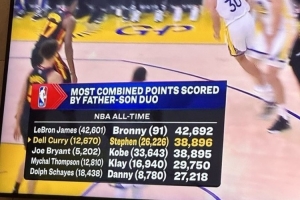 勇士主场不敌老鹰,比赛中库里的得分来到26226,和父亲戴尔·库里的父子总得分38896超越科比父子,升至父子组合得分榜历史第二。