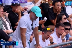 澳网男单首轮,布云朝克特对阵沙波瓦洛夫,布云朝克特目前0-1落后,巨星周杰伦也在现场观看这场比赛。澳网开赛前,周杰伦参加了澳网组织的一球制胜比赛。