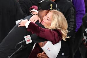 并且,珍妮·巴斯还将自己的INS头像换成了2020年湖人夺冠后,她与詹姆斯相拥的照片。