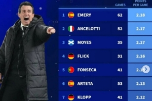 体育资讯1月23日讯 本赛季维拉在欧联杯表现出色,7战6胜1负,德转也盘点了自2020年以来各位主帅在欧战场均积分榜,其中埃梅里居首,具体如下(至少执教30场比赛):