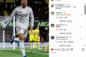 本场比赛姆巴佩梅开二度,其中包括一粒勺子点球。赛后姆巴佩也在社媒晒出本场庆祝进球照片,配文写道:“这就是皇马!”
