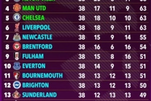 根据超级计算机的预测,维拉将排名第三,曼联和切尔西则位居第四和第五位,利物浦无缘前五位居第六。至于积分榜上半区其他位置,分别由纽卡、布伦特福德、富勒姆和埃弗顿占据。值得一提的是,热刺最终只能位居第十四位。