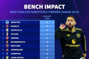 本赛季英超替补球员进球数量:布莱顿9球最多,曼城、曼联1球垫底