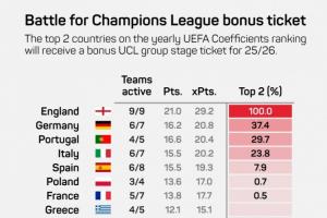 新赛制欧冠中,欧战积分排名前二的联赛可额外获得一个欧冠名额。