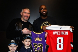 NHL华盛顿首都人队官推晒出一段本场观战的首都人队球星亚历克斯·奥维契金赛后与湖人前锋詹姆斯交换签名球衣的互动片段。