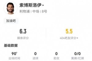 体育资讯1月5日讯 利物浦在本轮英超对阵富勒姆,索博斯洛伊本场客串右边锋数据如下: