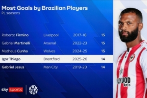 巴西球员单赛季英超进球最多纪录:
