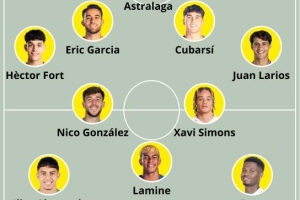 中场:哈维·西蒙斯、尼科·冈萨雷斯、安苏·法蒂、亚马尔、阿霍马克